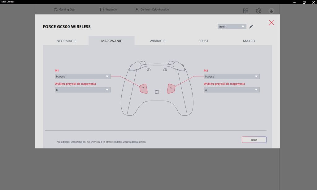 Warto wspomnieć również o oprogramowaniu MSI Center, które służy do konfiguracji kontrolera MSI Force GC300 Wireless. Aplikacja pozwala m.in. zmieniać przypisanie przycisków, regulować ustawienia triggerów, zarządzać wibracjami, tworzyć makra czy aktualizować firmware kontrolera. Dzięki temu można dopasować podstawowe zachowanie pada do własnych preferencji.